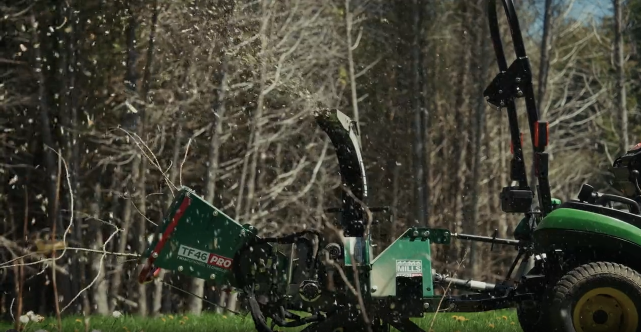La TF46 PRO fonctionne sur des tracteurs de 15 à 30 CV à la prise de force. Elle possède une grande ouverture de trémie d'alimentation de 48 cm x 48 cm qui se rétrécit jusqu'à une ouverture de 10 cm x 15 cm où le rouleau de 13 mm de diamètre saisit les branches et les fait passer dans la déchiqueteuse. Des matériaux d'un diamètre de 1/4" (6 mm) à 4" (10 cm) peuvent être introduits dans la TF46 PRO.
